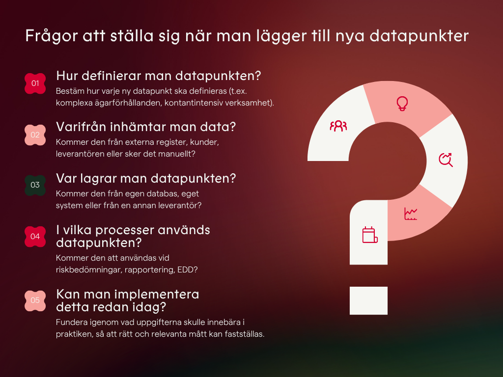 Data har länge varit en central del av ett effektivt AML-arbete. Med AMLR blir det ännu tydligare vilka uppgifter som behöver samlas in, hur de ska struktureras och hur de ska kopplas till både riskbedömningar och operativa resultat.